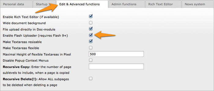 TYPO3 geht automatisch auf das Formular des Standard-Dateiheraufladen zurück, falls der Flash-Plugin nicht gefunden wird, auch ist es möglich, dass das Heraufladen überhaupt nicht funktioniert. Falls dies der Fall ist, öffnen Sie das Modul > Benutzer-Konfiguration: