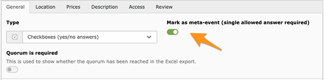 Marquer une question comme « méta-événement » permettra de contrôler finement cette « question » avec de nombreuses options supplémentaires telles que les dates de début et de fin, le lieu (salle XYZ), le prix, etc.