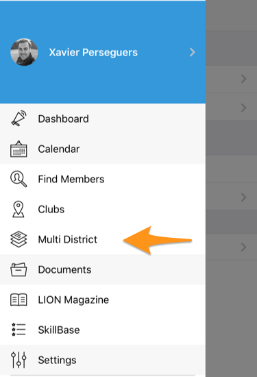 Voor informatie over uw Multiple District (de raad, de conventies, de districten, …), open het menu en kies “Multiple District”: